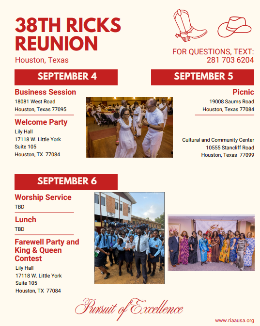 Since 1989, Dragons, supporters, family, and friends have come together during the Labor Day Weekend from across the US, Europe, and Africa for fellowship, fundraising, and celebration in support of Ricks Institute. This year, all roads lead to Houston, TX, where the Southwest Chapter, led by Chapter Coordinator Edwina Barchue, is working diligently to ensure a wonderful experience for the entire Dragon Family. Alongside your Board of Directors, I am excited to invite you to the 2026 RIAA-USA, Inc. Annual Convention, September 4–6, 2026. I am polishing my cowboy boots, brushing off my cowboy hat, and looking forward to a meaningful and memorable “boots on the ground” gathering.